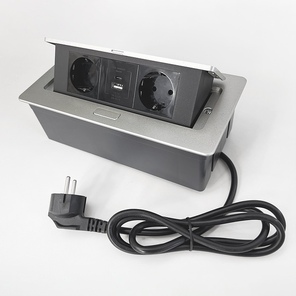 Настольный бокс на 2 розетки с USB+Type-C 26x12x7 см, шнур 1,5м, серебристый
