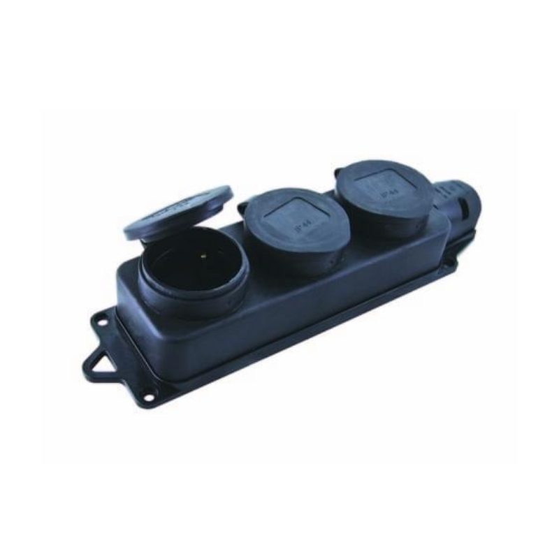 Розетка наружной установки тройная с заглушками - широкий спектр использования. Безопасная система заземления. Защитная крышка для каждого разъема. Внешний корпус из эластичного каучука.