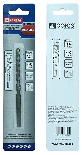 1055-08-08x120 сверло по бетону с твердосплавной напайкой с треугольным хвостовиком, Союз
