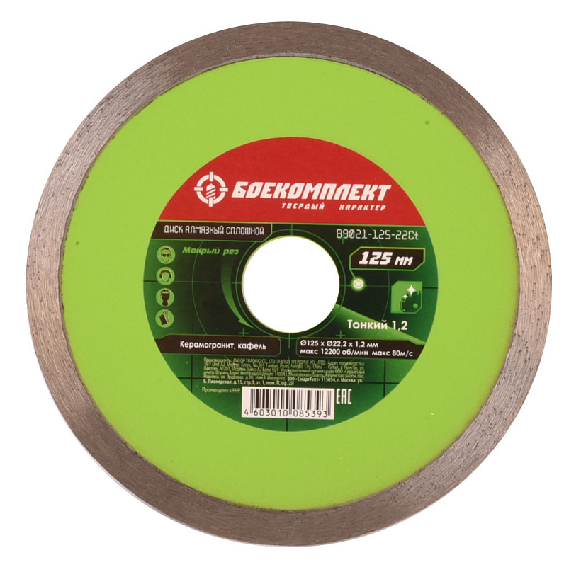 Диск алмазный сплошного типа для мокрой резки по кафелю, керамике и керамической плитке, мрамору позволяет получить ровные края без сколов и трещин. Уникальность диска заключается в тонком 1,2 мм, чистом и ровном распиле. Высокое содержание алмазов и высота режущей кромки 10 мм увеличивают износостойкость и срок эксплуатации диска; технология самозаточки позволяет диску сохранять высокую скорость реза даже при длительной работе; тело диска из стали марки 65Mn для ровного реза, метод горячей опрессовки при производстве для наилучшей адгезии.