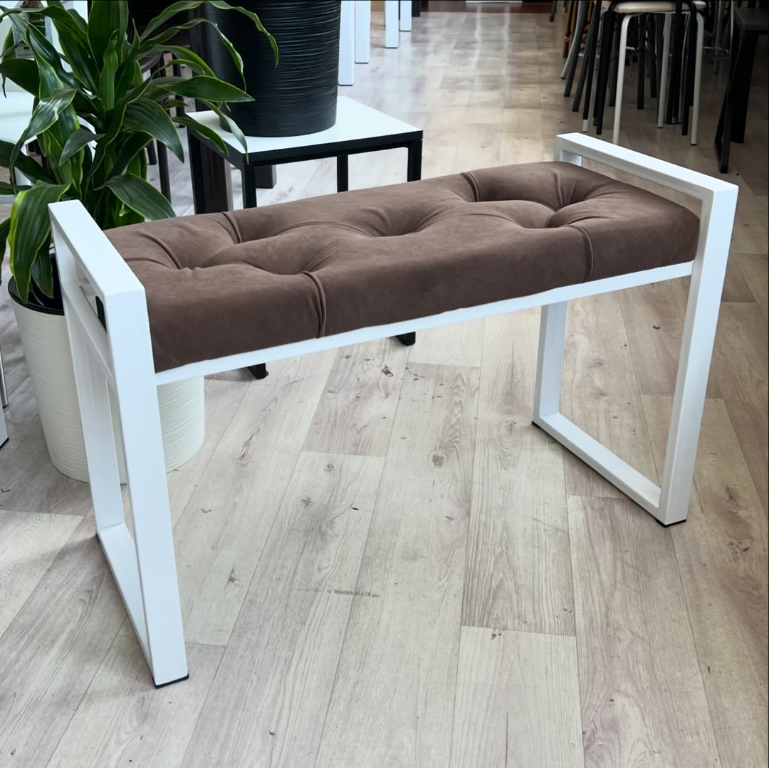 Модель в стиле Loft выполнена с мягкой сидушкой в ткани велюр коричневого цвета и с коретной стяжкой, каркас цельно-металлический с покрытием полимерно-порошковой краской белого цвета. Размер В×Ш×Г: 500×800×300мм.