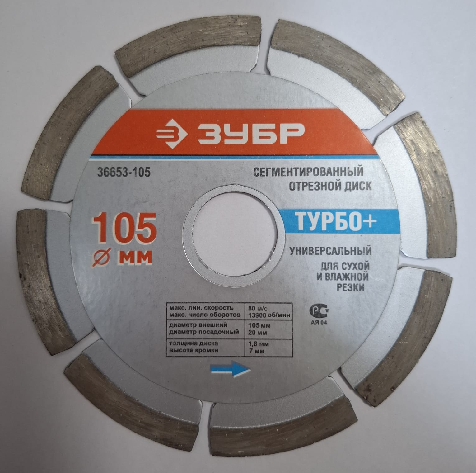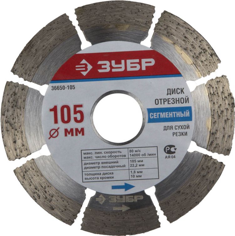 Диск алмазный сегментированный "ТУРБО+" ЗУБР 36653-105 предназначен для резки бетона, гранита, кирпича, камня, мрамора и других строительных материалов. Он применяется совместно с угловой шлифовальной машиной для сухой и влажной резки.