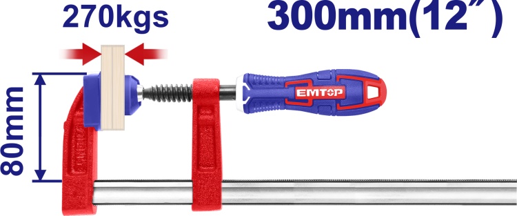 Струбцина тип F от EMTOP для применения при проведении, столярных, монтажных, строительных работ и ремонта.