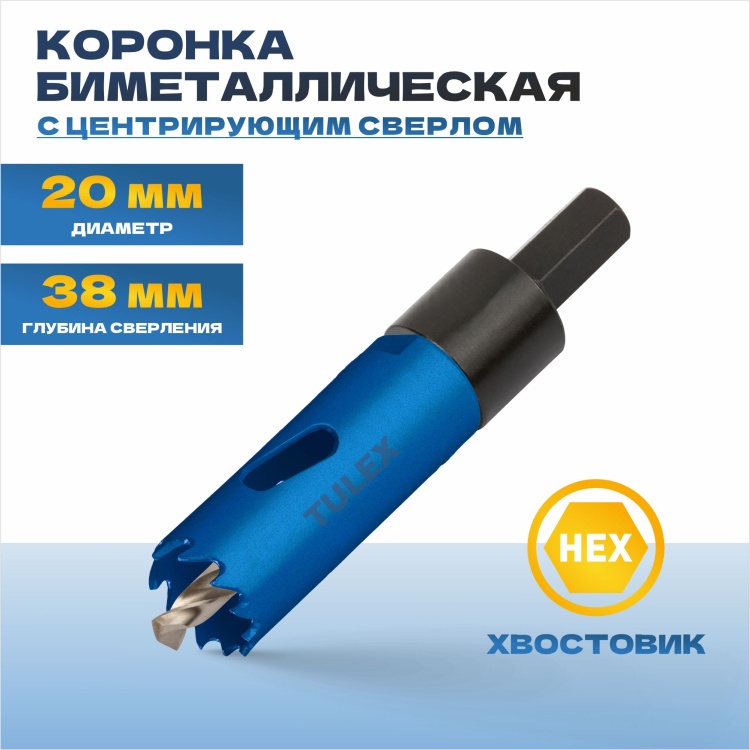 Коронка биметаллическая TULEX, шестигранный хвостовик,с центрирующим сверлом,в сборе 20мм 601013-020