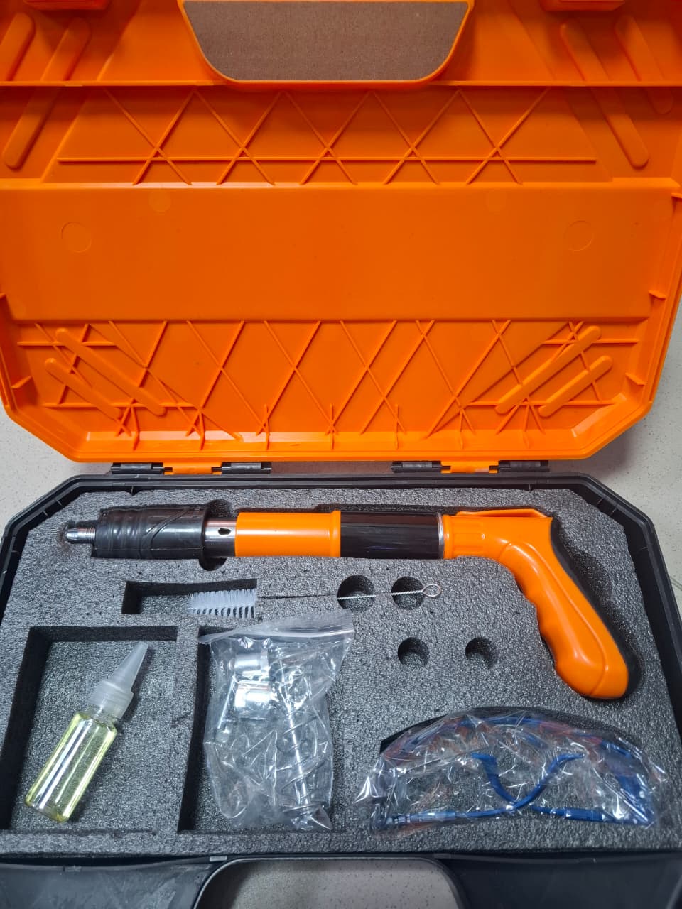 Комплектация: кейс, масло, пистолет для дюбелей, щетка для чистки, дополнительные детали для замены, очки.
