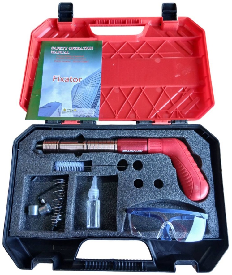 Комплектация: кейс, масло, пистолет для дюбелей, щетка для чистки, дополнительные детали для замены, очки.