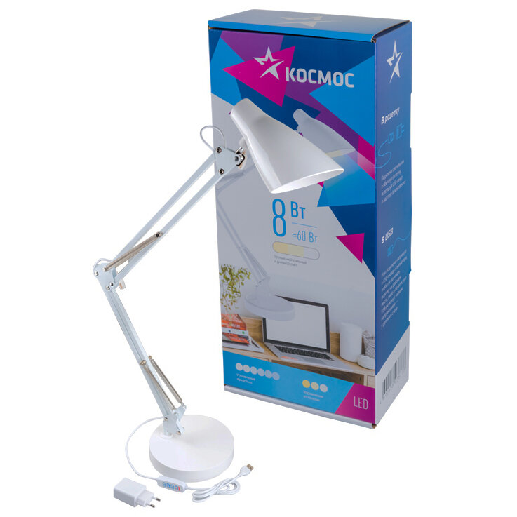 Настольная диммируемая лампа КОСМОС 8Вт, RA80, 3 режима цветности, Белый, 5В, 2А KOC_DESK037