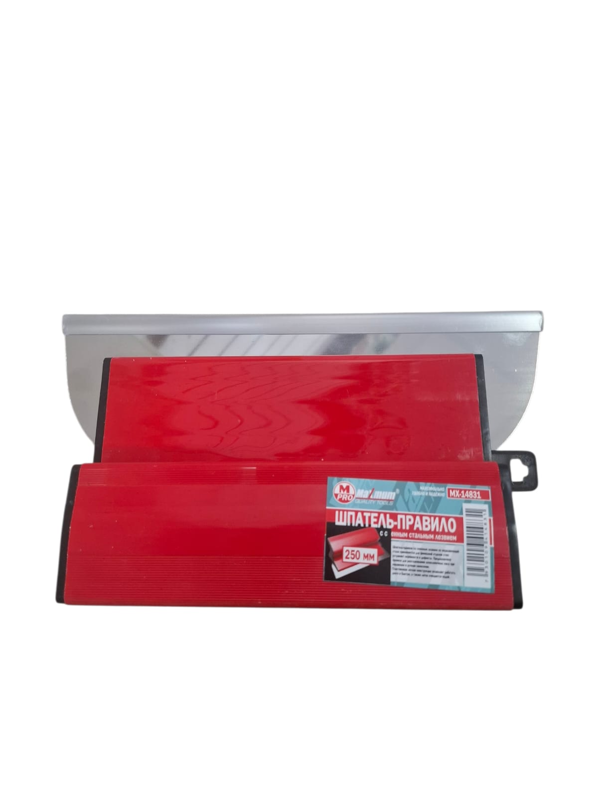 Шпатель 250 мм длиной используется совместно с маяками при распределении штукатурки или шпатлевки, работать с ним удобно как одной, так и двумя руками.