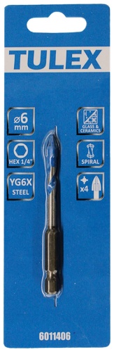 Сверло TULEX 6011406 по кафелю, керамике, стеклу, с пылеудалением, 4 реж. лезвия, 6-гр. хв. 1/4, 6мм