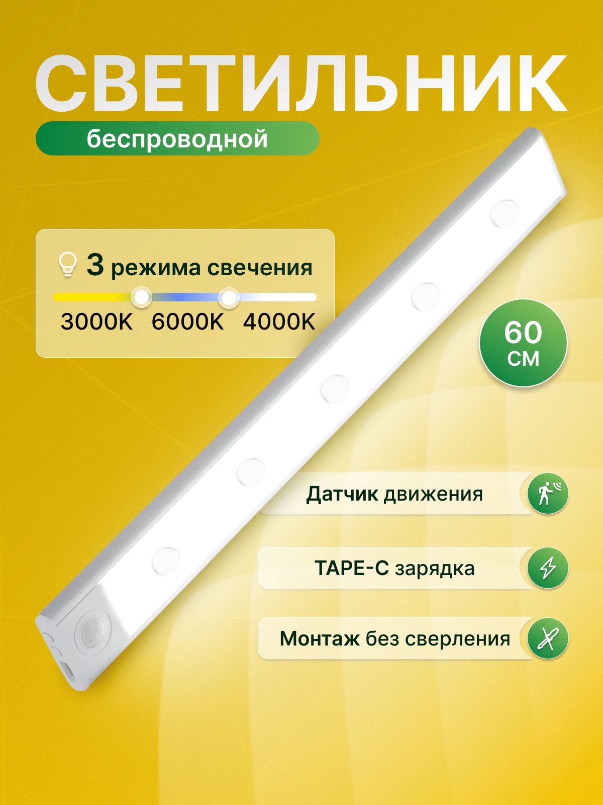 Светильник беспроводной с датчиком 600 ммм 3000-6500K