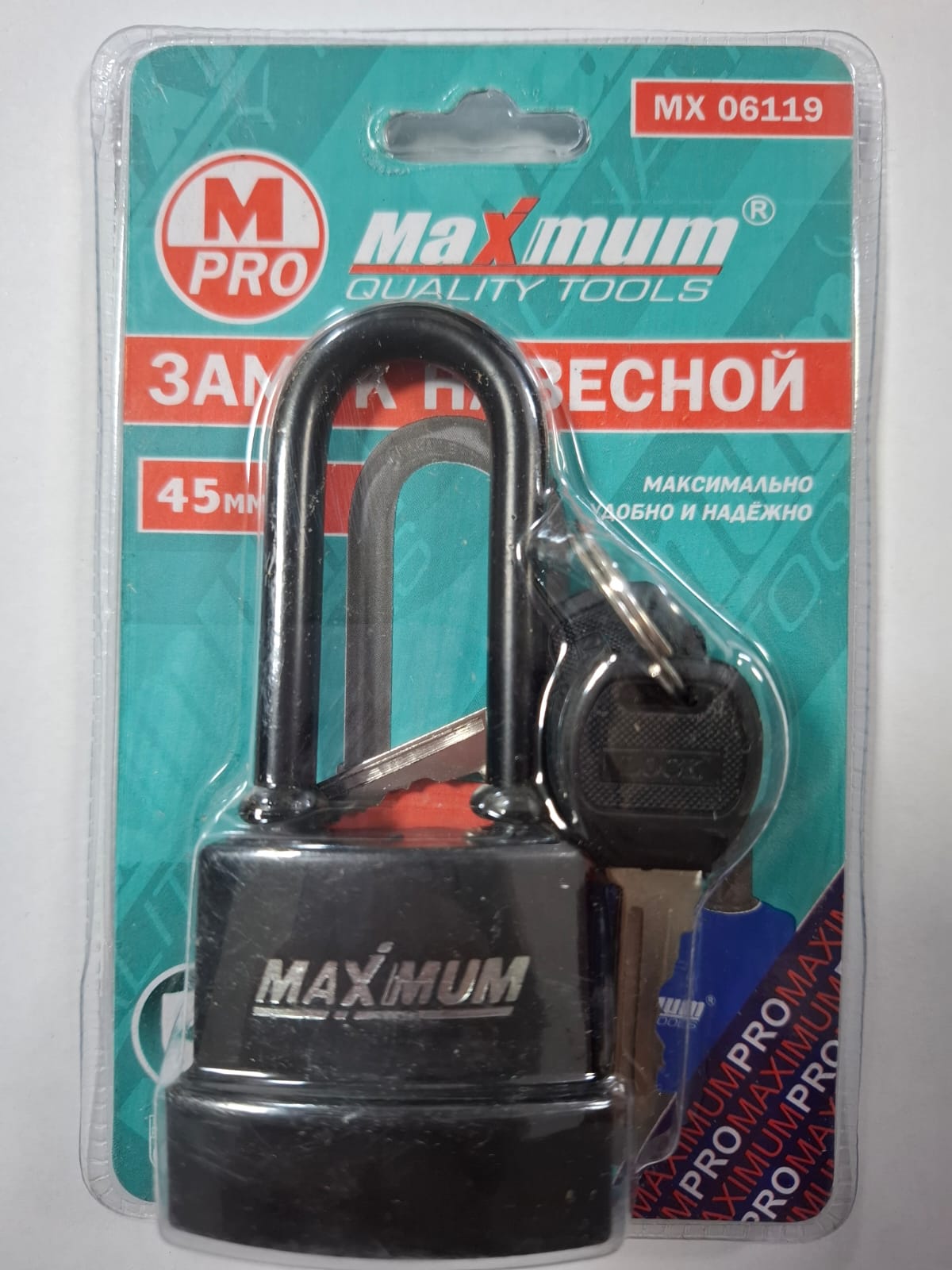 Всепогодный замок навесной 45 мм "MAXIMUM QUALITY TOOLS" создан со специальным длинным ушком толщиной 6 мм.